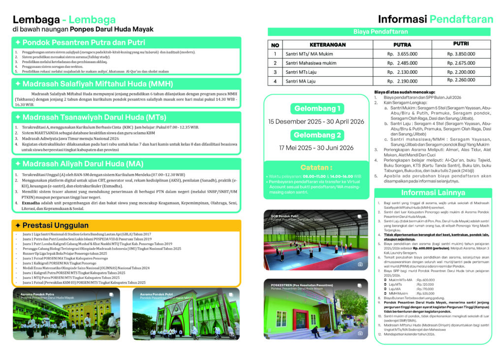 Informasi Pendaftaran Santri Baru Tahun 2025 Pondok Pesantren Darul Huda Mayak Ponorogo